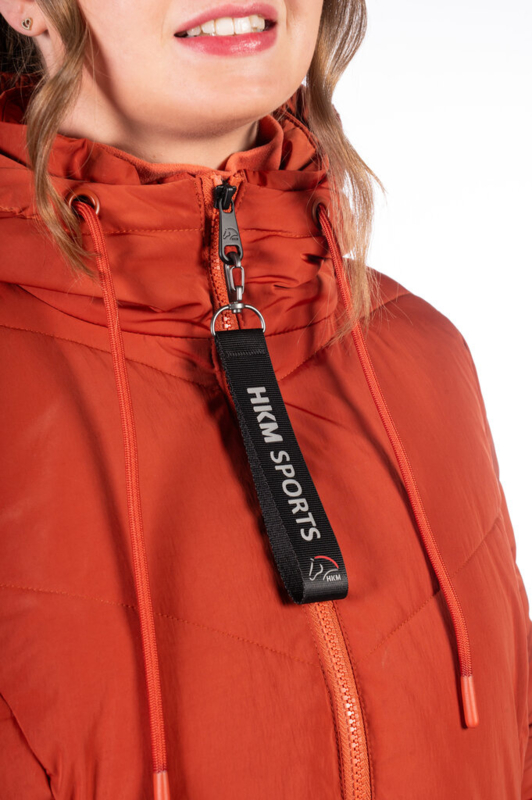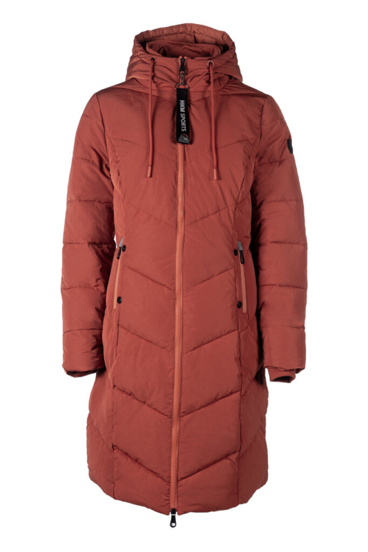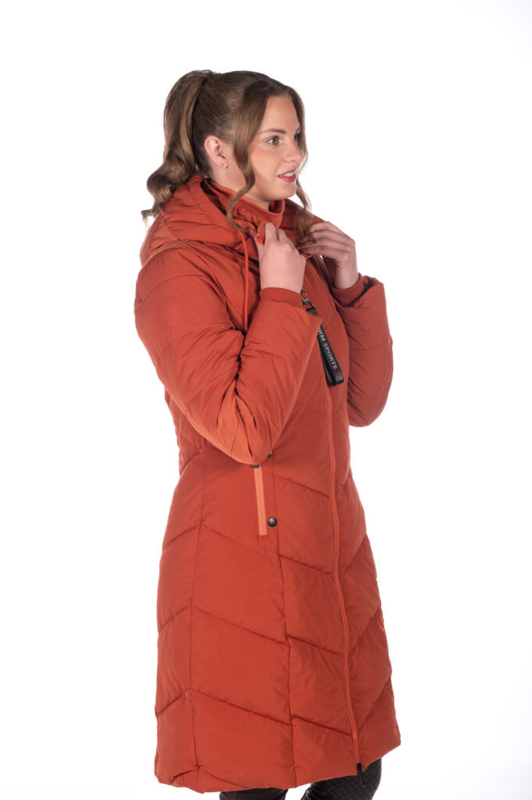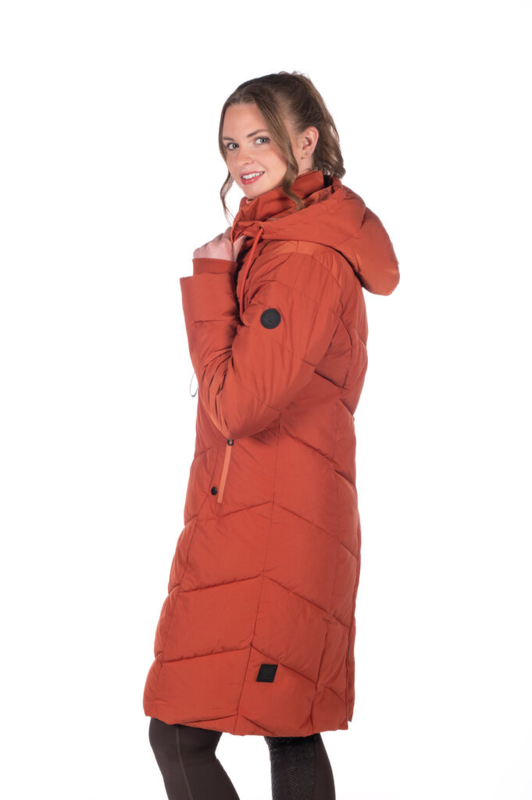 Heerlijk warme, lange winterjas. Voorzien van opstaande kraag en capuchon, twee zakken met warme fleecevoering en rits, een ruime binnenzak en een twee-weg ritssluiting. Aan de achterzijde is de jas voorzien van een ruime openritsbare split waardoor deze jas ook zeer goed in het zadel te gebruiken is. Deze jas is goed ademend, winddicht, goed water- en vuilafstotend en mag in de wasmachine worden gewassen op 30 gr. C. Mag in de droogtrommel. Materiaal: 70%% polyester, 30% nylon. Voering en vulling: 100% polyester.