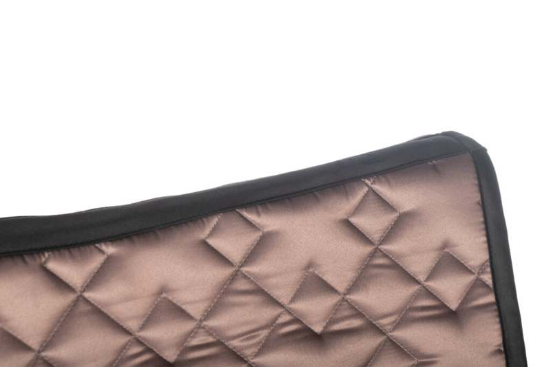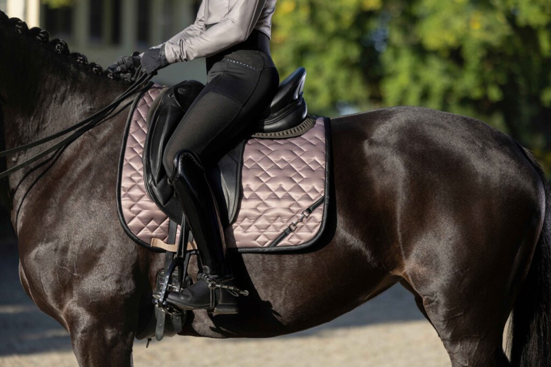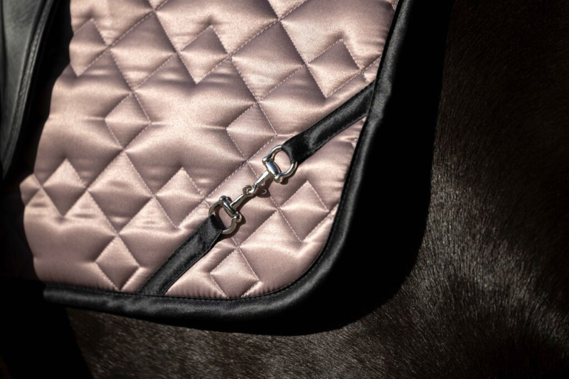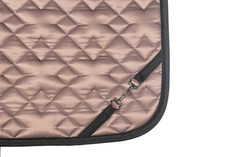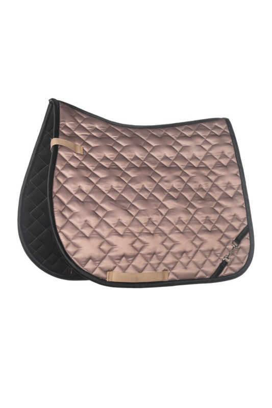 Anatomisch gevormd zadeldek uit de Lauria Garrelli-collectie van HKM. Voorzien van een stevige vulling, een goed vocht absorberende zachte voering, lussen voor de singel en lussen voor de singelstoten met klittenbandsluiting. De zachte satijnglans, de afwerking met een bies en een mooi bitje, maken dit tot een zeer chique dekje. Materiaal: 100% polyester. Maschinewasbaar tot 30 gr.C.